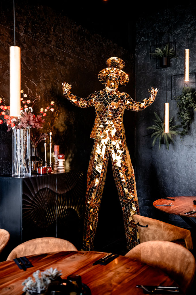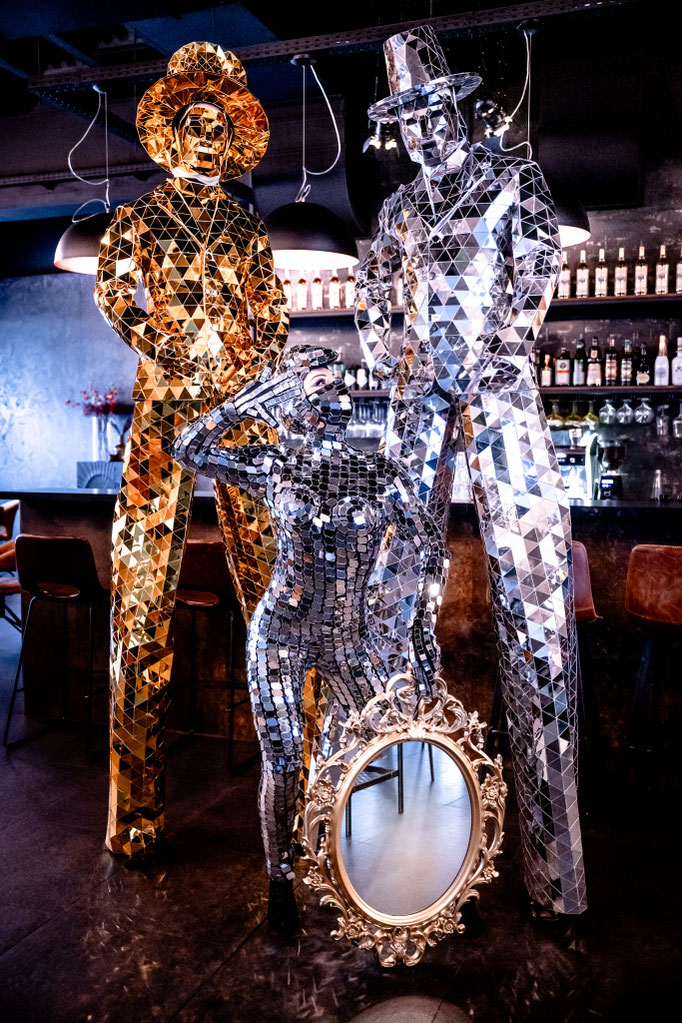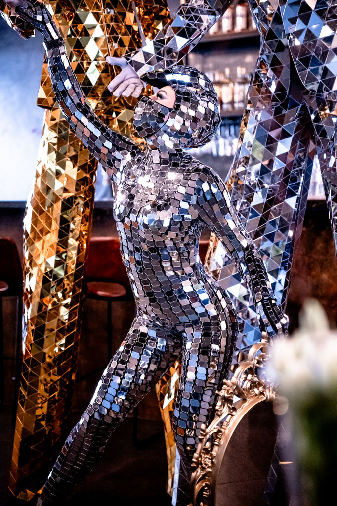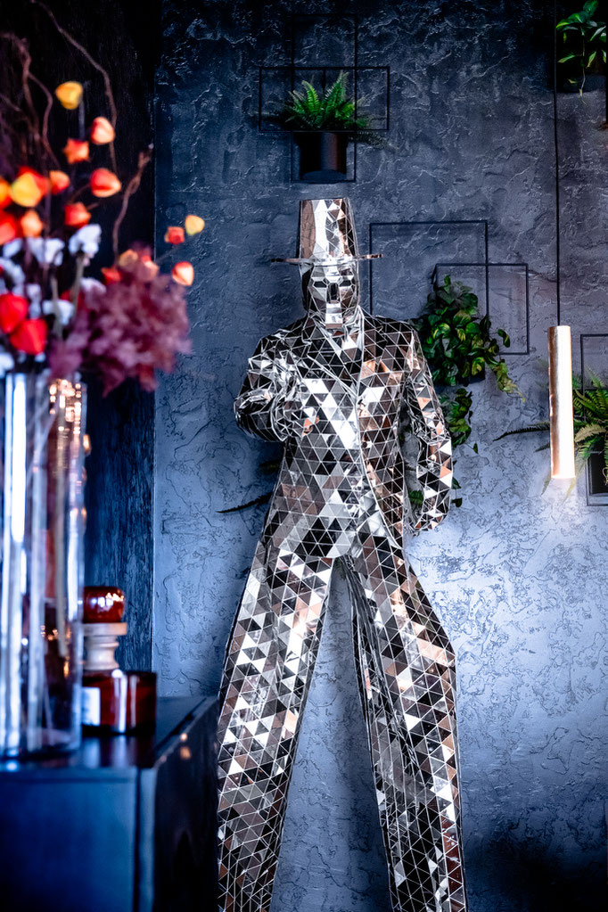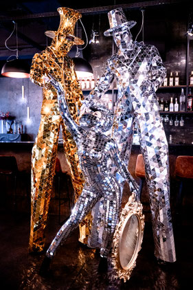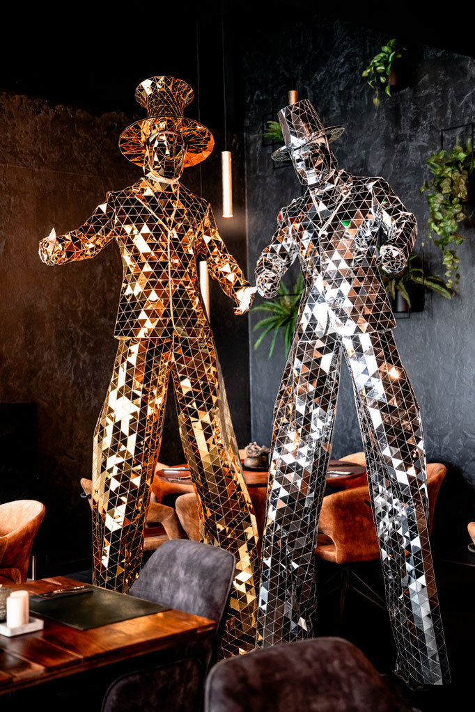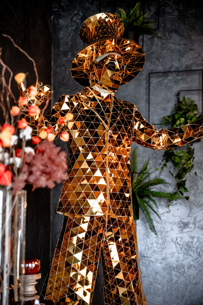 Ein absoluter Hingucker: Der glänzende Mirror Man auf Stelzen in silber oder gold zieht alle